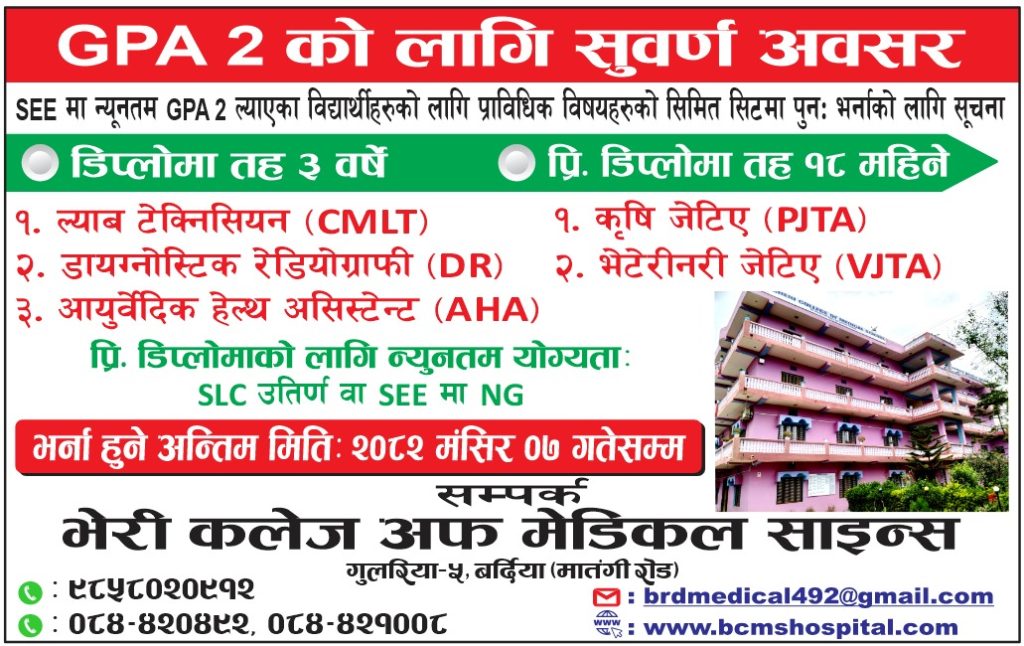 Bheri College of Medical Science provides high-quality medical education with a focus on practical training and community involvement. Our programs prepare students for successful careers in healthcare.